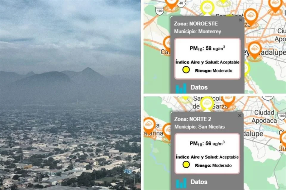 Al corte de las 11:00 horas, dos estaciones ilustraron con claridad el problema. San Nicolás Norte 2 reportó 56 microgramos por metro cúbico de PM10. Monterrey Noroeste marcó 58 microgramos.